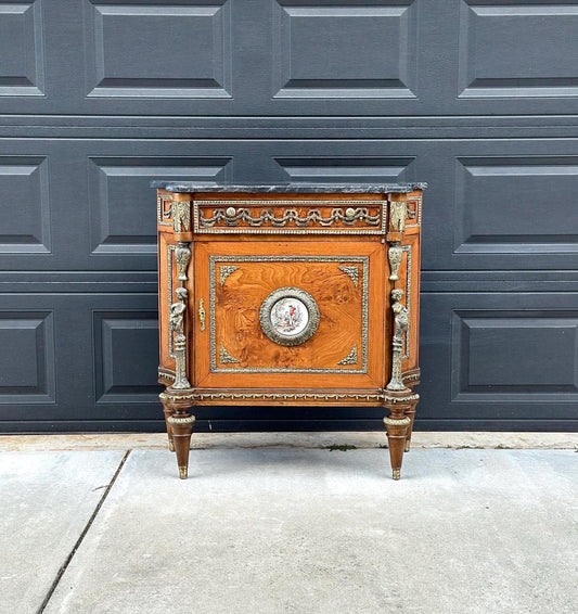 Antique 1880's French Louis XVI Marble Top Cabinet with Hand Painted Porcelain Plaque & Ormolu Mounts